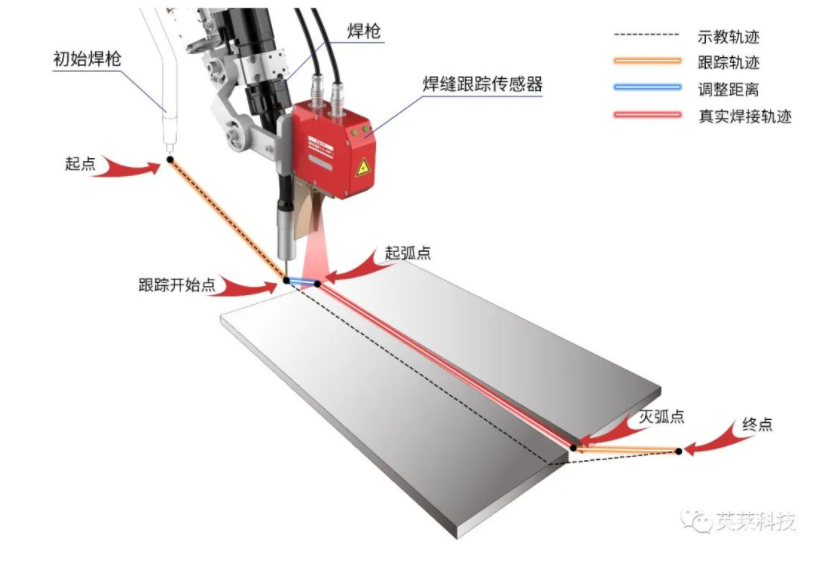 工業(yè)機(jī)器人安裝英萊焊縫跟蹤系統(tǒng),通過(guò)視覺(jué)傳感器在焊接前或焊接過(guò)程中對(duì)焊縫實(shí)時(shí)檢測(cè),可引導(dǎo)工業(yè)機(jī)器人自主調(diào)整焊接的路徑,糾正焊接的偏差,保證焊接的質(zhì)量。